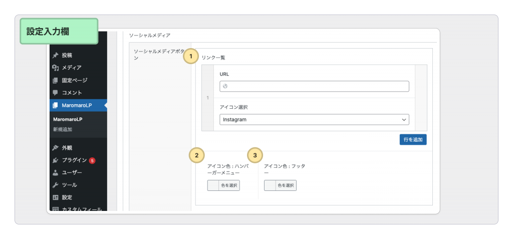 ソーシャルメディアリンクの設定入力欄は下記の画像のようになります。